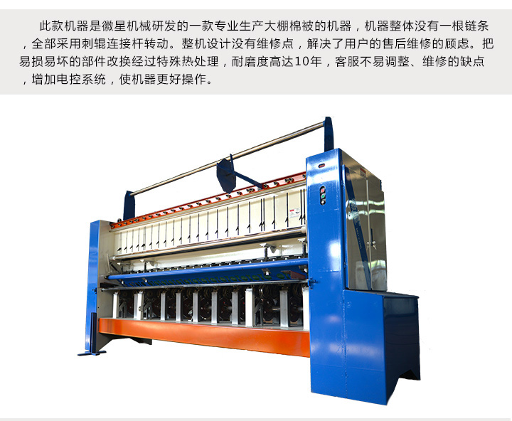 產品簡介:2米寬幅保溫被棉被機多針大棚被保溫被縫被機用途和特點:本設備是生產家庭用棉被、絲棉被、棉門簾、大棚保溫被、車載保溫被等最新型設備。2米寬幅保溫被棉被機已突破傳統單線鏈式結構,改用雙線平縫結構。